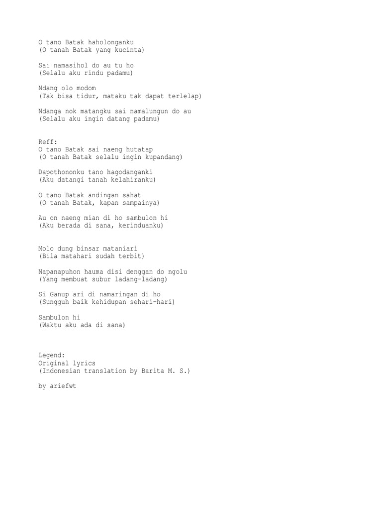 Nanti malah 1 not angka bisa butuh 7-10 halaman. O Tano Batak Sai naeng hutatap Dapothononhu Tano hagodanganghi O Tano Batak Andigan sahat Au on naeng mian di ho sambulokhi. Nada dasar yang dinyanyikan adalah Do G mayor.