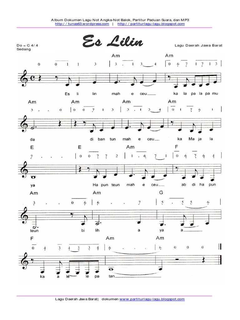 Not pianika es lilin - lagu daerah nusantara tradisional indonesia - not angka. Not Angka Pianika Es Lilin - Nining Meida. Es Lilin mah ceuceu didorong-dorong Namun tidak apa-apa jika seperti di bawah ini karena jenis lagu seperti ini seperti pantun bisa berubah-ubah liriknya.